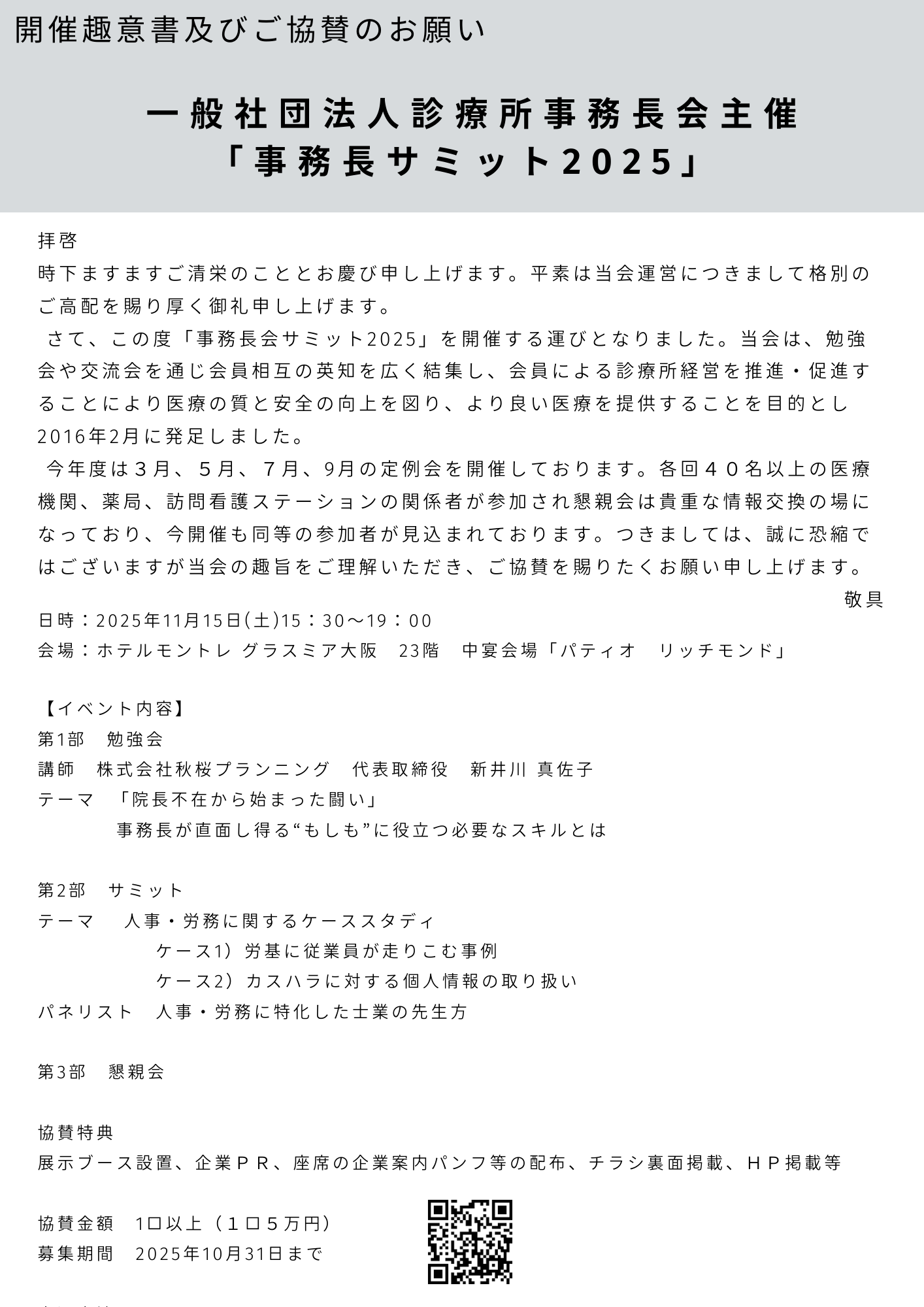 さて、この度「事務長会サミット2025」を開催する運びとなりました。当会は、勉強会や